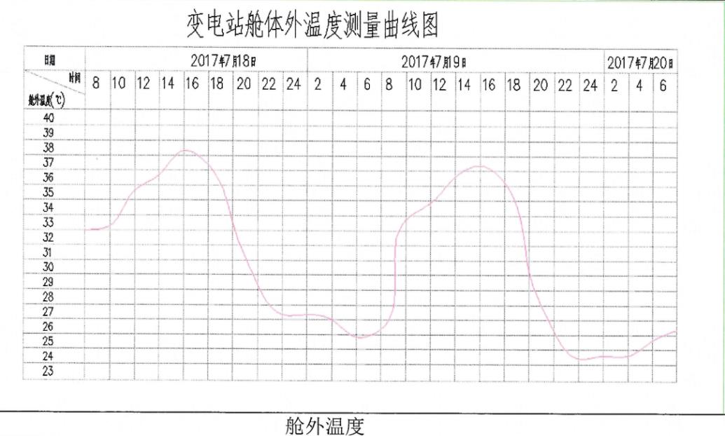 湘能楚天預制艙委托江蘇省江測檢測技術服務有限公司就預制艙的內部溫濕度的恒定性進行現場測試驗證。選取夏季節做了艙體的溫升試驗, 測溫如下圖所示,測溫列表如下,可以看出:外部環境的溫差變化在14攝氏度左右時,艙內溫度的變化在0.5攝氏度左右。